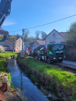 Eine weitere Baumaßnahme am Butterwasser startete ebenfalls Anfang Mai. Im Bereich Mittelstraße 39 wird durch die Fa. Neumeister auf einer Länge von ca. 30 m die in den Bach gerutschte Uferbefestigung gegen eine Böschung mit einem flacheren Neigungswinkel ausgetauscht. Gleichzeitig wird im Zuge der Maßnahme die in diesem Bereich vorhandene Einleitstelle der Regenentwässerung von der Neukircher Straße durch den AZV „Obere Spree“ angepasst.