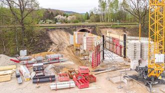 Das neue Brückenbauwerk an der Eisenbahnstrecke nach Zittau nimmt weiter Formen an. Der Hochbaukran steht seit Ende April und das Einschalen der ersten Wandelemente ist bereits erfolgt. Die Firmen Hentschke und STL bauen im Auftrag der Deutschen Bahn bis Herbst dieses Jahres.