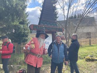 Nachdem am Freitag frühlingshafte 20 Grad Celsius herrschten meldete man für Sonntag einen Temperatursturz bis unter 0 Grad Celsius. Und so war es dann auch. Dennoch trafen sich um 10:00 Uhr über 40 Wanderlustige an der Pumphutfigur am Rathaus. Der Wilthener leibhaftige Pumphut begrüßte sie dort, informierte über die Geschichte der Figur und nach lustigen Erklärungen übernahm Tilmann Schwenke von den Naturfreunden die Führung der Gruppe.