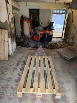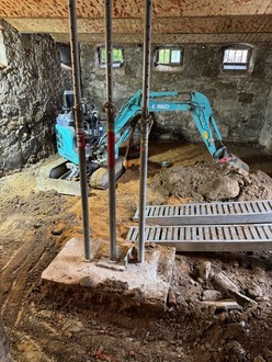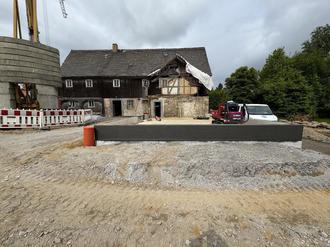 Auch im Monat Mai gab es rege Bauaktivitäten im Stadtzentrum von Wilthen. Nachdem die Betonarbeiten fertiggestellt waren, begannen wir mit den Abdichtungsarbeiten. Parallel dazu wurde die umlaufende Drainage verlegt, die Regenentwässerungsleitungen an die späteren Einbindepunkte geführt und die Schmutzwasserleitungen verlegt. Zeitgleich dazu erfolgte durch den Abwasserzweckverband „Obere Spree“ die Verlegung des Hausanschlusses in das Grundstück. Nachdem alle Leitungen um das Gebäude verlegt wurden, konnten die Arbeitsräume wieder verfüllt werden. Aber auch im Gebäude wurde fleißig „gewerkelt“. Die vorhandenen Granit- Krustenplatten wurden ausgebaut und für den späteren Wiedereinbau gesichert. Im alten Stall und in der ehemaligen Blockstube wurde der Untergrund für den neuen Fußbodenaufbau hergerichtet und es wurde damit begonnen, die alten Putzflächen im Gebäude abzuschlagen. Ab Ende Mai wurde das Gerüst aufgebaut, damit Anfang Juni der Dachdecker mit seinen Leistungen beginnen konnte.