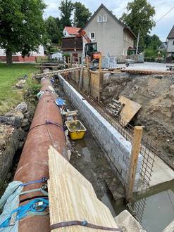 Im Bereich der Papiermühle sind bereits ca. 30 m der neuen Stützwand errichtet.