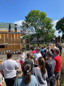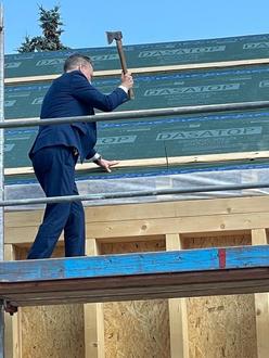 Am 20. Juni konnte das traditionelle Richtfest am Kultur- und Begegnungszentrum (INTERREG Projekt) im Stadtzentrum gefeiert werden. Nach der Begrüßung durch Bürgermeister Michael Herfort und Zimmermeister Volker Tauchmann von der gleichnamigen Zimmerei schlug der Bürgermeister den symbolischen letzten Nagel auf dem Dach ein.