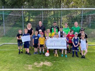 Ein Teil der erlaufenen Summe, die beim Sponsorenlauf der Pumphut-Grundschule zusammengekommen sind, sollen unseren Bambinis und unserer F-Jugend zugutekommen. Dazu übergab Katja Trötscher vom Förderverein der Pumphut-Grundschule zwei Schecks in Höhe von 450 € an die Spieler und Trainer der beiden Teams.