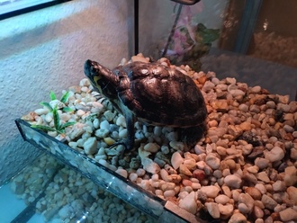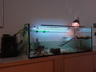 Im Juni 2025 konnte unsere Kindergarten-Schildkröte namens „Links“ endlich in ihr schönes, neues Schildkrötenzuhause umziehen. Es bietet viel mehr Platz zum Schwimmen und Sonnen. Außerdem wurde der alte kleine Innenfilter durch einen neuen Außenfilter ersetzt, der für sauberes Wasser sorgt.