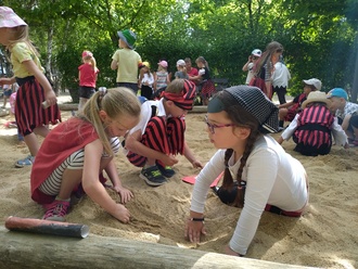 In den Sommerferien gab es jede Woche einen Ferienhöhepunkt für die Krippen- und Kindergartenkinder im Spatzenhaus. In der ersten Ferienwoche begaben wir uns mit den Piraten auf Schatzsuche und konnten viele Edelsteine in den Sandkästen unseres Gartens entdecken. In der zweiten Ferienwoche besuchte uns Herr Männel mit seinem Puppentheater und spielte das Märchen „Der Wolf und die sieben Geißlein“.