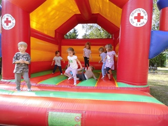 In der dritten Ferienwoche sorgte eine Hüpfburg im Garten für großes Vergnügen. Neben den Kindern aus der Krippe und dem Kindergarten freuten sich auch die Hortkinder sehr darüber.