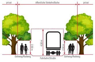 Deshalb - wie schon in den vergangenen Jahren auch - hier wieder die Erinnerung und dringende Bitte an unsere Grundstückseigentümer, ihre Grundstücksgrenzen zu öffentlichen Verkehrsflächen zu kontrollieren. Sind in den letzten Monaten oder sogar Jahren Bäume, Sträucher, Stauden oder auch Gras in den Bereich der angrenzenden öffentlichen Verkehrsfläche hineingewachsen? Dann sind diese Pflanzenteile aus dem Verkehrsraum (an der Grenze zur Verkehrsfläche) zu entfernen! Über den Geh- und Radwegen bis in eine Höhe von 2,5 m, über Fahrbahnen bis in einer Höhe von 4,5 m haben keine Äste zu hängen.