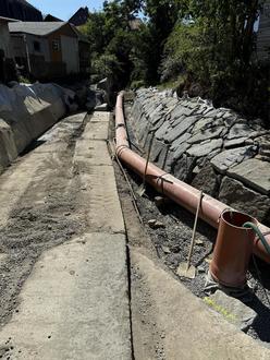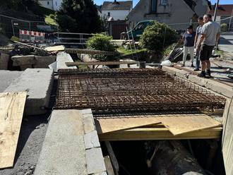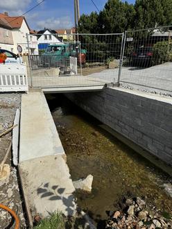 In der ersten Juliwoche wurden die Schal- und Bewehrungsarbeiten für die neue Brücke fertiggestellt und am 10.07.2024 wurde diese dann betoniert. Der erste Belastungstest folgte kurz darauf mit den beiden Starkregenereignissen in der 28. Kalenderwoche. Alle Medienleitungen sind eingebracht und die Zufahrt zum Grundstück Talstraße 6 ist wieder gewährleistet. In Abstimmung mit dem LRA Bautzen und der SAB Dresden ist es uns gelungen, auch die Stützwand und die Böschung auf der straßenabgewandten Seite in die Schadensbeseitigungsmaßnahme aufzunehmen. Derzeit erfolgen hier die Fundamentarbeiten vor dem Wohnhaus Talstraße 7. In diesem Bereich wird auf ca. 10 Meter hinter der Brücke eine baugleiche neue Stützwand errichtet. Der nachfolgende Bereich bis zum Zufluss des Irgersdorfer Wassers wird mit einer naturnahen Böschung hergestellt.