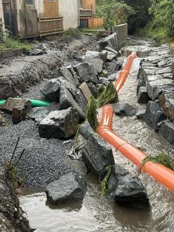 Nach dem Abriss des alten Wehres und dem Einbau der Wasserhaltung begannen im Juli die eigentlichen Bauarbeiten. Nach dem Einbau einer Baustraße wurde durch den Baubetrieb zügig die erste Böschung auf der Nordseite des Butterwassers hergestellt. Jedoch zeigten uns die beiden Regenereignisse am 10.07.2024. und 12.07.2024 eindeutig auf, dass die mit den beteiligten Fachbehörden abgestimmte Planung so nicht umsetzbar ist. In einem gemeinsamen Vororttermin mit dem LRA Bautzen, dem Planungsbüro, dem Baubetreib und der Stadtverwaltung wurde gemeinsam die neue Bauweise (Fußsteine zu zwei Drittel eingelassen und eine Hinterfüllung mit Beton) festgelegt und so durch den Baubetrieb auch umgesetzt. Auch die Baustraße wurde in die Baugrube hineinverlegt. Im Monat August soll die südliche Seite hergestellt werden und es beginnen die Arbeiten an der Gewässersohle.