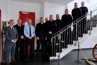 Foto: André Seidig und Christoph Kummer mit Jan ter Jung, Paul Winter und den Teilnehmenden der Grundausbildung @Feuerwehr Wittenberg
