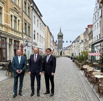 Am 27.05.2025 empfing Oberbürgermeister Torsten Zugehör den Botschafter der Republik Litauen S.E. Giedrius Puodžiūnas im Alten Rathaus. Im Anschluss zeigte er dem Botschafter gemeinsam mit SKW-Chef Carsten Franzke die Schlosskirche und die Cranach-Höfe.