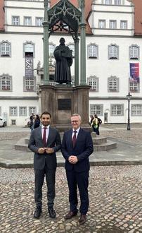 Am 30.06.2023 empfing Bürgermeister André Seidig den Botschafter der Vereinigten Arabischen Emirate, S.E. Herrn Ahmed Waheeb Maaz Ahmed Alattar im Alten Rathaus. Nach kurzer Begrüßung und munterem Small Talk trug sich der Botschafter ins Goldene Buch der Lutherstadt ein. Anschließend besprachen sie Möglichkeiten und Ideen einer Zusammenarbeit im wirtschaftlichen und kulturellen Bereich.