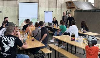 Bis zu 15 junge Erwachsene waren der Einladung in die Trendsporthalle des RaSk e. V. in der Kreuzstraße gefolgt. Bürgermeister André Seidig begrüßte die Teilnehmer, übergab T-Shirts, und bekräftigte, dass „solche Workshops genau die Gelegenheiten sind, seine Wünsche und Vorstellungen mitzuteilen und sich aktiv in die Gestaltung und Entstehungsprozesse einzubringen. Denn mit ihrer Mithilfe kann die Stadt einen Platz schaffen, der dauerhaft Freude bringt und intensiv genutzt wird.“