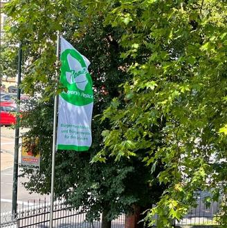 Foto: Mayors for Peace Flagge vor dem Neuen Rathaus, # Foto: Stadtverwaltung