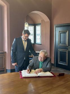 Am 10.08.2024 empfing Oberbürgermeister Torsten Zugehör den Botschafter der Mongolei S.E. Herrn Mandakhbileg Birvaa im Alten Rathaus. Nach kurzer Begrüßung trug sich der Botschafter in das Goldene Buch der Lutherstadt ein. Anschließend besprachen beide Herren Möglichkeiten und Perspektiven einer Zusammenarbeit, u. a. im wirtschaftlichen Bereich. So wurde beispielsweise die Ausbildung von Pflegekräften junger Menschen aus El Salvador als erfolgreiches Vorzeigeprojekt genannt, das sich auf andere Länder übertragen lassen könnte. Auch eine künftige kulturelle Zusammenarbeit sowie mögliche Städtepartnerschaften waren Gegenstand des Gesprächs.