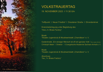 Anlässlich des Volkstrauertages laden wir Sie sehr herzlich ein, mit uns eine gemeinsame Gedenkstunde um 11.30 Uhr auf dem Neuen Friedhof in der Dresdener Straße zu begehen.