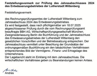 „Der Stadtrat der Lutherstadt Wittenberg stellt den mit Prüfbericht der Wirtschaftsprüfungsgesellschaft BBH AG Wirtschaftsprüfungsgesellschaft, München, Zweigniederlassung Erfurt vom 18. Juli 2025 geprüften und bestätigten Jahresabschluss des Entwässerungsbetriebes Lutherstadt Wittenberg für das Wirtschaftsjahr 2024 fest.