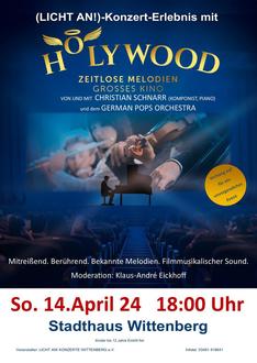 HOLYWOOD nimmt mit auf eine Reise zu den schönsten Melodien von damals und heute, inszeniert als gefühlsgewaltige Filmmusik und begleitet von spektakulären Naturaufnahmen. Auf der Leinwand spielt das legendäre Sinfonie-Orchester German Pops Orchestra. Live am Piano spielt der Mann, der HOLYWOOD erfunden und komponiert hat, Christian Schnarr.