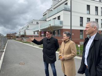 Im Alten Rathaus stellten sie der Ministerin zunächst in einer Präsentation das Wohngebiet Wittenberg West sowie das in Kleinwittenberg neu entstehende Quartier Am Stadthafen vor. Die darin aufgezeigte Quartiersentwicklung reichte bis zum Sturmereignis „Kyrill“ im Jahr 2007 zurück, das insbesondere in Wittenberg West sehr schwere Schäden anrichtete und umfangreiche Sofortreparaturen nötig machte. In der Fortschreibung des Stadtentwicklungskonzepts von 2008 wurde die Schadenslage als Chance verstanden und der dauerhafte Erhalt der Siedlung als städtebauliche Zielsetzung festgeschrieben. Wohnungsangebote wurden daraufhin modernisiert und erweitert, die soziale Infrastruktur verbessert und der öffentliche Raum aufgewertet. Wichtige Partner bei dieser Quartiersentwicklung sind und waren die WIWOG und die WBG. In den Jahren 2007 bis 2023 hat beispielsweise die WIWOG insgesamt 13,1 Mio. EUR für Bau- und Sanierungsarbeiten in das Quartier investiert.