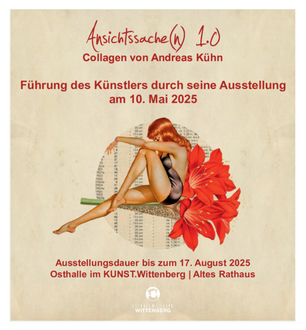 Am 10.05.2025 um 16 Uhr führt der Künstler Andreas Kühn im KUNST.Wittenberg im Alten Rathaus durch seine Ausstellung. Eine Voranmeldung ist nicht notwendig.