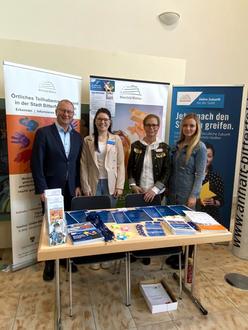 Oberbürgermeister Armin Schenk, Sachbearbeiterin Personal Sharleen Lieb, Teilhabemanagerin Claudia Hammerschmidt und Ausbildungsleiterin Lisa Eibig (v.l.n.r.) am Info-Stand der Stadt Bitterfeld-Wolfen