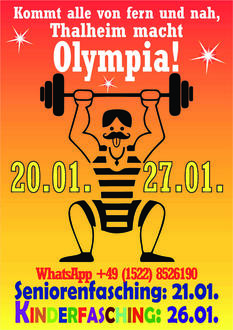 Unter dem Motto „Kommt alle von fern und nah, Thalheim macht Olympia!“ möchte der Faschingsklub sein Programm präsentieren. Danach wird wie immer mit den Gästen bis in die frühen Morgenstunden gefeiert und getanzt. Karten können ab sofort per WhatsApp unter +49 (1522)8526190 bestellt werden.