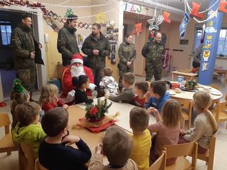 Stabsfeldwebel Attila Cserep sprach als Weihnachtsmann verkleidet mit dem „Sonnenkäfern“ und überbrachte Geschenke. Die KiTa-Kinder freuten sich über den Besuch der Uniformträger der III. Inspektion.