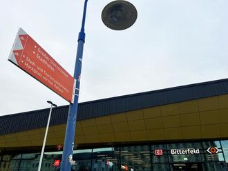 Die neue Beschilderung am Bitterfelder Bahnhof zeigt Besucherinnen und Besuchern den Weg zu den touristischen Highlights.