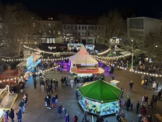 Blick aus dem Historischen Rathaus auf den Bitterfelder Weihnachtsmarkt