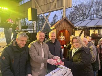 Stollenanschnitt auf der Historischen Weihnacht in der Wolfener Fuhneaue: WBG-Geschäftsführer Christian Puschmann, Marcel Urban als Vetreter der Stadt Bitterfeld-Wolfen und Ortsbürgermeister André Krillwitz verteilten den Riesenstollen gemeinsam zur Eröffnung.