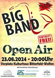 Das bereits zur Tradition gewordene Big Band-Open Air findet auch in diesem Jahr wieder auf dem Vorplatz des Städtischen Kulturhauses Bitterfeld-Wolfen statt. Am 23. August, um 20:00 Uhr, ist es wieder soweit: Unter der Leitung von Gunter Ecke werden in bewährter Programmfolge wieder beliebte Melodien von beispielsweise Glenn Miller, James Last oder Bert Kämpfert erklingen.