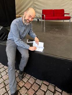 Auto Benny Berger signiert seine Festschrift. Sie ist in der Stadt- und Tourismusinformation erhältlich.