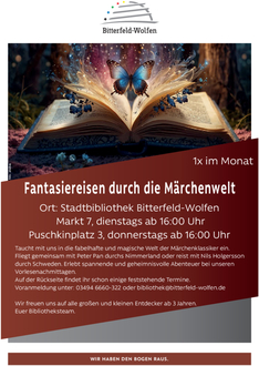 Im August entführt die Stadtbibliothek Bitterfeld-Wolfen Kinder ab 3 Jahren und ihre Eltern auf eine ganz besondere Reise: eine Fantasiereise zu Alice im Wunderland. Dabei geht es um mehr als nur Zuhören. Kleine und große Besucherinnen und Besucher tauchen gemeinsam ein in eine Welt voller Geheimnisse, Legenden und Abenteuer. Spielerisch, spannend und kindgerecht aufbereitet, bietet die Aktion die Gelegenheit, Fantasie zu wecken und die Freude am Zuhören zu fördern.