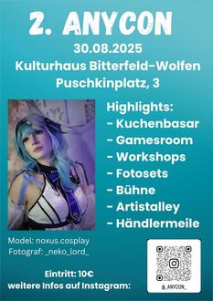 Farbenfroh, kreativ und voller Community-Spirit: Die „Anycon 2025“ verwandelt das Kulturhaus Wolfen in einen Treffpunkt für Fans von Anime, Games, Cosplay, Tabletop und Popkultur. Besucherinnen und Besucher erwartet ein abwechslungsreicher Convention-Tag mit Bühnenprogramm, Gamesroom, Artist Alley, Händlermeile, Kuchenbasar, Tabletop-Raum und Bring&Buy. Ob Cosplay-Neuling, Gaming-Fan oder langjähriger Convention-Liebhaber – die „Anycon“ bietet Raum für Inspiration, Austausch und jede Menge Spaß.