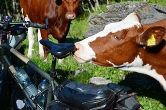 Tierischer "Damenbesuch" am Fahrrad und Zelt des Weltenradlers