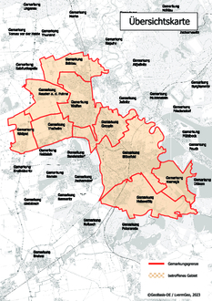 Das Gebiet ist in der beigefügten Übersichtskarte gekennzeichnet. Allen beteiligten Eigentümern, Erbbauberechtigten und Nutzungsberechtigten werden diese Veränderungen des Liegenschaftskatasters durch die Offenlegung bekannt gemacht.