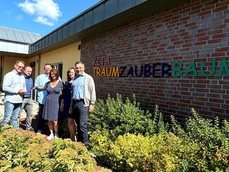 Am 29. Juli trafen sich alle Partner zu einer kleinen offiziellen Übergabe: Joachim Teichmann (Amtsleiter für Bildung/Kultur/Soziales der Stadt Bitterfeld Wolfen), Patrick Engelhardt (Sachbereichsleiter Schule/Kita der Stadt Bitterfeld-Wolfen) Jan Wilke (Bereichsleitung KITA, Euro-Schulen), Simone Hempel (Leiterin der Kita „Traumzauberbaum“), Silke Zinke (Geschäftsführerin Trägerwerk) und Jörg Rommelfanger (Geschäftsführer Trägerwerk) vor der Kindertagesstätte „Traumzauberbaum“. Alle freuen sich auf die künftige Zusammenarbeit mit dem Trägerwerk.