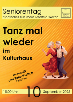 „Tanz mal wieder“ heißt es danach von 15 bis 18 Uhr im Saal 063. Der österreichische Sänger Otto Adelmann wird mit „Hits aus allen Zeiten“ den Tanznachmittag gestalten. Ein Gastronom erwartet die teilnehmenden Seniorinnen und Senioren zur Tanzveranstaltung mit Kaffee, Kuchen und kalten Getränken.