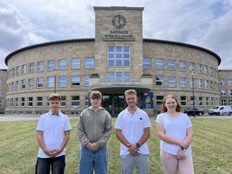 Die vier neuen Auszubildenden zum/zur Verwaltungsfachangestellten freuen sich über ihren beruflichen Start bei der Stadt Bitterfeld-Wolfen (v. r. n. l.): Joyce Surosz, Joey Schimmelpfennig, Eric Zepper und Emil Weber.