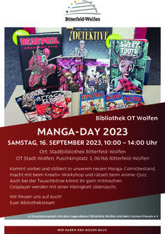 Die Stadtbibliothek Bitterfeld-Wolfen lädt in Zusammenarbeit mit dem Jugendbeirat Bitterfeld-Wolfen und dem Connect People e.V. zum 1. Manga-Day ein. An diesem Tag wollen wir unsere neue Manga-Bibliothek einweihen. Sie ist klein aber fein und wird zukünftig weiterwachsen. Alle Manga-Interessierten sind am Samstag, den 16. September 2023 von 10:00 – 14:00 Uhr in die Stadtbibliothek OT Stadt Wolfen, Puschkinplatz 3, 06766 Bitterfeld-Wolfen recht herzlich eingeladen. Vieles rund ums Thema „Manga“ erwartet euch. Alles kann einfach ausprobiert werden. Ein neuer Manga-Bestand mit unterschiedlichsten Titeln, ein Kreativ-Workshop, oder ein Anime-Quiz sind an diesem Tag im Angebot. Für diejenigen die sich künstlerisch austoben wollen, gibt es außerdem eine Ecke, in der man eine Leinwand mitgestalten kann oder einfach zeichnerisch an seiner Technik feilen kann, um vielleicht irgendwann mal zur oder zum Mangaka zu werden. Außerdem gibt es eine Tauschbörse. Bei der kann ganz unkompliziert mitgemacht werden. Also alles was das Thema des Tages betrifft und nicht mehr gebraucht wird, kann gegen andere Mangas o.ä. getauscht werden. Je mehr mitmachen, umso größer sind dabei die Möglichkeiten. Diejenigen, die im Cosplay erscheinen, werden mit einer Kleinigkeit überrascht.