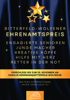 Die Stadt Bitterfeld-Wolfen bittet um Vorschläge für den Ehrenamtspreis, der im Rahmen der Weihnachtsgala „Tausend Sterne sind ein Dom“ vergeben werden soll. Der Ehrenamtspreis wird in folgenden Kategorien vergeben: „Junge Macher“, „Kreative Köpfe“, „Hilfe mit Herz“, „Retter in der Not“ sowie „Engagierte Senioren“. Jede der Kategorien ist mit 200 Euro dotiert. Eine Jury wird unter allen Einsendungen den Ehrenamtspreis 2023 in der jeweiligen Kategorie vergeben. Vorschläge können bis zum 20. November 2023 unter folgender Adresse eingereicht werden: