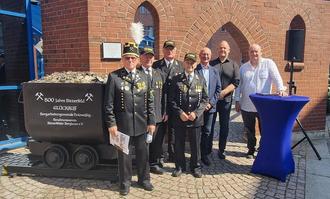 Mitglieder des Traditionsvereins Bitterferlder Bergleute e.V. (l.) übergaben den Förderwagen an die Stadt Bitterfeld-Wolfen: Oberbürgermeister Armin Schenk, Ortsbürgermeister Kay-Uwe Ziegler und Ortsbürgermeister Hans-Jürgen Präßler (v.l.n.r.) freuten sich über die Dauerleihgabe.