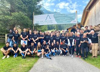 Alle Teilnehmenden am „Internationalen Jugendcamp“ 2024 in Mallnitz stellten sich für ein gemeinsames Gruppenfoto auf.
