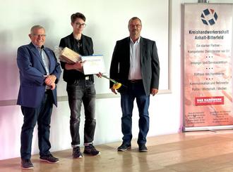 Kreishandwerksmeister Roland Prokop (li.) und Obermeister der Holz- und Metall-Innung Anhalt-Zerbst, Volker Pietrek (re.) gratulierten Tischlergesellin Lea Clasen (Mi.), die Jahrgangsbeste aller Absolventen wurde.