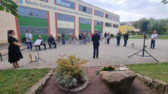 Oberbürgermeister Armin Schenk, Vertreter der Kommunalpolitik, Schülerinnen und Schüler des Europagymnasiums „Walther Rathenau“ Bitterfeld und des Heinrich-Heine-Gymnasiums Wolfen sowie Bürgerinnen und Bürger der Stadt Bitterfeld-Wolfen versammelten sich vor dem Anne Frank Denkmal auf dem Vorplatz des MehrGeneratonenHauses im Ortsteil Stadt Wolfen.