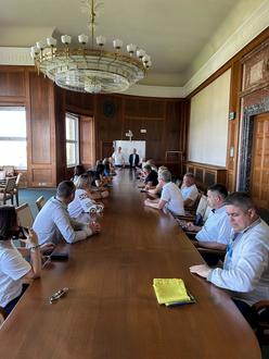 Oberbürgermeister Armin Schenk empfing die ukrainischen Bürgermeister und Fernwärme-Verantwortlichen am 8. September im Konferenzsaal des Wolfener Rathauses. Danach führte sie ihre Studienreise in die städtischen Bäder.