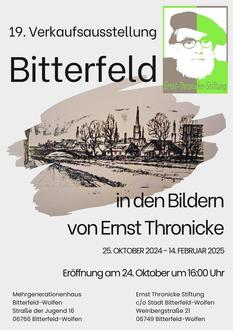 Die Ernst-Thronicke-Stiftung eröffnete am 24. Oktober ihre 19. Verkaufsausstellung im MehrGenerationenHaus Bitterfeld-Wolfen im Ortsteil Wolfen. Im Fokus stehen diesmal die Werke von Ernst Thronicke, die die Entwicklung der Stadt Bitterfeld in seinen einzigartigen Bildern festhalten.