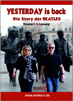Das Duo Wolke X verzaubert uns mit leidenschaftlichen Interpretationen der BEATLES-Welthits. Egal ob „Yesterday“, „Help“, „Hey Jude“ oder „With a little help of my friends“, so gut wie alle haben wir schon einmal gehört. Die szenische Lesung „Yesterday is back – Die Story der Beatles“ erzählt von den Anfängen der Band bis hin zur Trennung und darüber hinaus. Musik, eindrucksvolle Fotoshows und Videos über eine bewegte Zeit erwarten Sie an diesem Abend. Freuen Sie sich auf eine vielschichtige, spannende und emotionale Konzertlesung am Freitag,