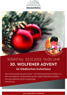 Alle Jahre wieder kommt die Weihnachtszeit, die Zeit der Besinnlichkeit und Freude. Am 1. Advent (3. Dezember) ist es wieder so weit. Der Kultur- und Heimatverein Wolfen lädt ab 14:00 Uhr zum bereits 30. Advents- und Weihnachtsmarkt mit buntem Programm in das „Städtische Kulturhaus“ in Wolfen ein. Besucher haben die Möglichkeit, Geschenke zu kaufen oder selber zu basteln. Für Groß und Klein - es ist für jeden etwas dabei. Als Stargast wird Susi Schuster, Country- und Jodl-Lady auf der Wolfener Bühne begrüßt. Weitere Programmhöhepunkte sind Marko Roye, das „Wolfener Ballettensemble“, der Gemischte Chor, der Spielmannszug Wolfen sowie die Flötengruppe. Für die kleinen Gäste spielen die Schüler der Grundschule „Erich-Weinert“ ein Märchenmusical. Für weihnachtliche Leckereien, Kaffee und Kuchen oder Glühwein ist in gemütlicher Atmosphäre gesorgt. Der Eintritt ist wie immer kostenfrei.