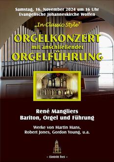 Am Samstag, 16. November, gibt um 16:00 Uhr in der Johanneskirche Wolfen (Leipziger Straße 81) unter dem Motto „In Classic Style“ ein Orgelkonzert. Kirchenmusiker René Mangliers singt und spielt an der Orgel Werke von Martin Mans, Gordon Young, Marko Hakanpää und Johannes Matthias Michel. Im Anschluss an das Konzert wird er für Interessierte die Orgel und ihre Funktionsweise erläutern und vorführen sowie Fragen beantworten. Auch aus der wechselvollen Geschichte des Wolfener Instruments wird er berichten. Der Eintritt ist frei, der Eingang barrierefrei und die Kirche bei Bedarf geheizt.